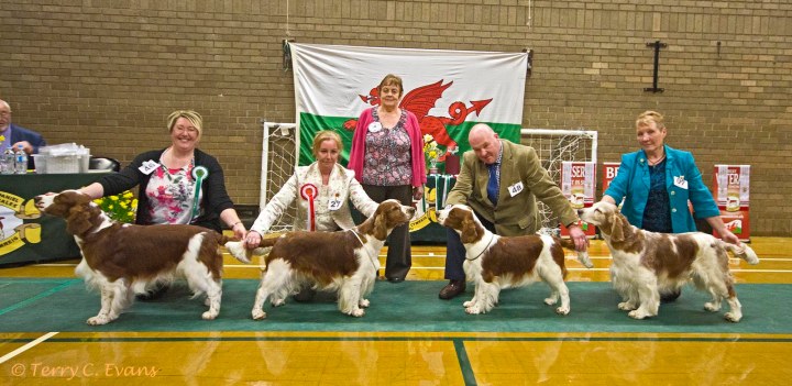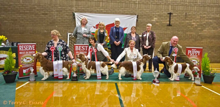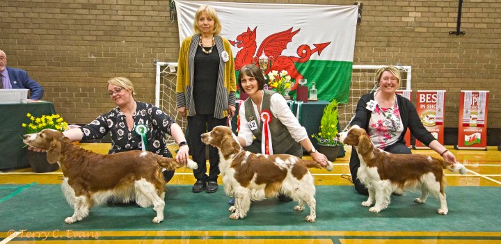 BB (centre) – Sh Ch Coedybrain Nia at Cwmbeili; RBB (left) – Glenbrows Fascination with Shannara; BPB (right) – Glenbrows Temptress; BVB – Glenbrows Fascination with Shannara. Welsh Springer Spaniel Club of South Wales Champ Show 24-03-2019, held at Chepstow, Wales.